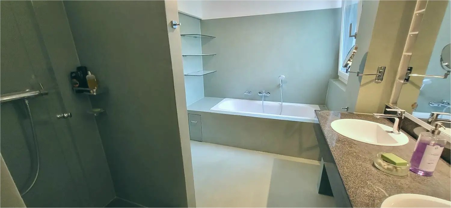 Fugenlose Böden und Wände bieten viele Vorteile. Denn wo es keine Fugen gibt, können sich Schmutz und Keime wesentlich schwerer absetzen, außerdem erhalten Sie eine wunderschöne, ebene und gleichmäßige Fläche.